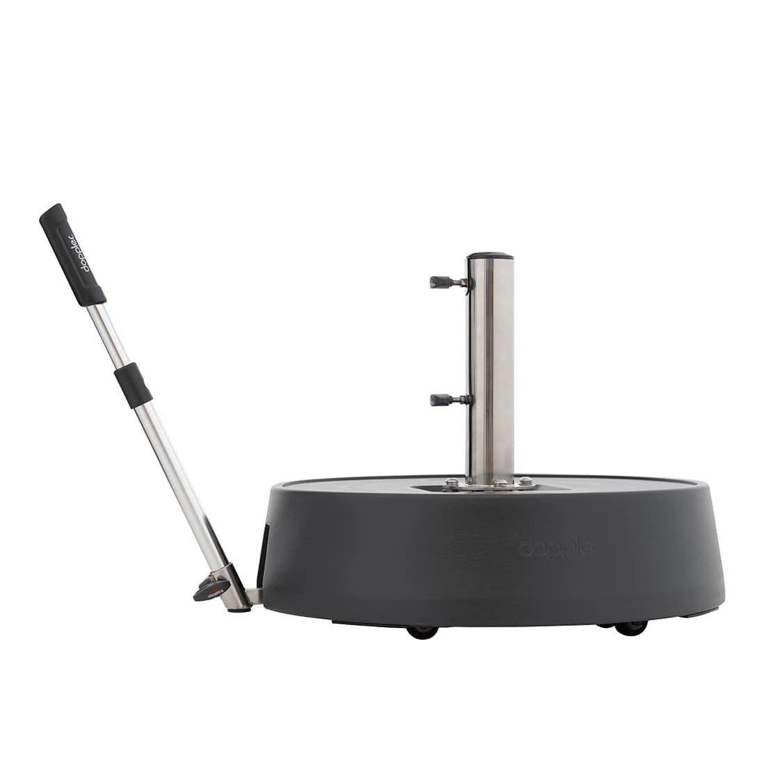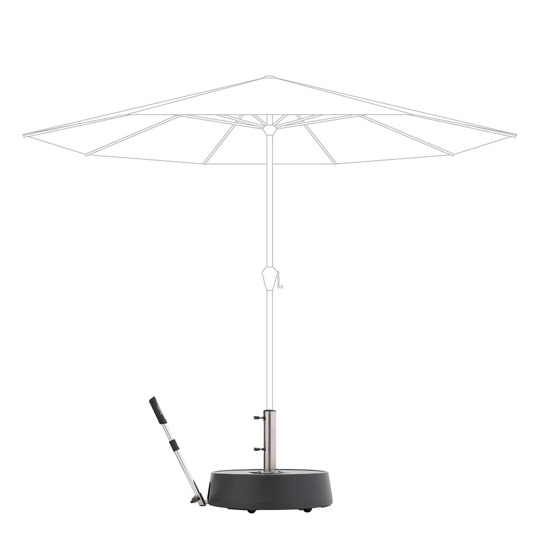 Mittels Liftfunktion des patentierten Fahrgestells kann der Schirmständer sehr leicht bewegt werden. Eine teleskopierbare abnehmbare Zugstange sorgt für weiteren Bediencomfort. Das Sockelgewicht beträgt ohne Dekorplatte ca. 45kg. Optional bestellbar stehen 4 Dessins an Dekorplatten (ca. 5kg.) zur Auswahl.