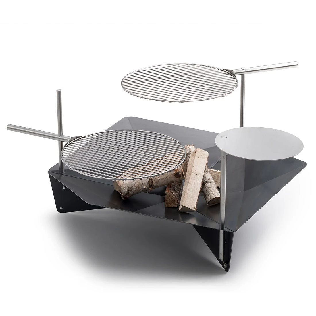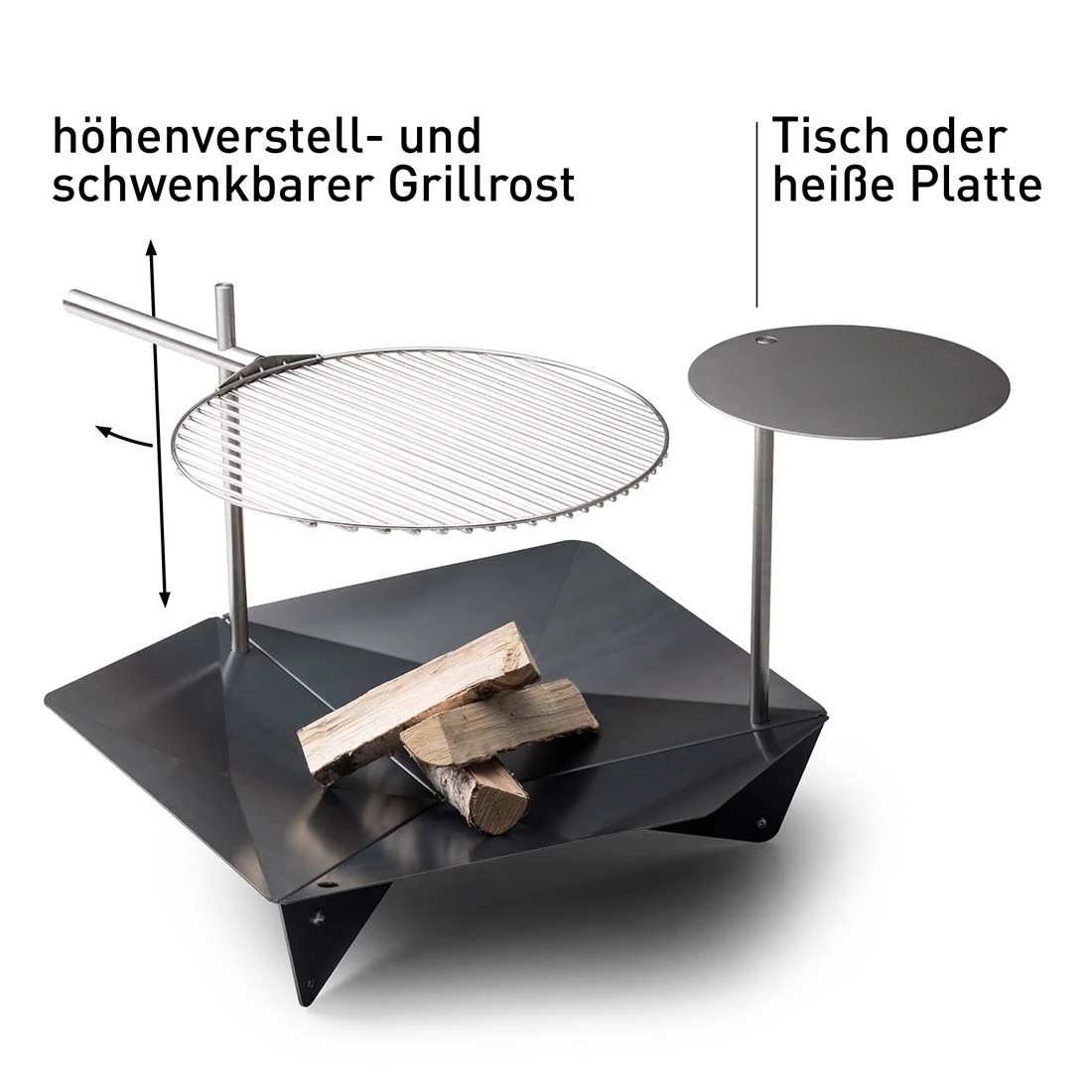 Auf der Ablagefläche finden eine Kanne Tee, Glühwein oder Grillgut Platz, genauso kann diese aber auch nach innen geschwenkt, abgesenkt und ein feuriger Eintopf gekocht werden.