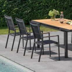 Das Gestell besteht aus pflegeleichtem und wetterfestem Aluminium. Für eine attraktive Optik ist das Gestell im Farbton Silber gehalten. Ein weiterer Pluspunkt des Stapelsessels ist die Bespannung mit Textilene in der Farbe Hellgrau. Dieser Bezugsstoff überzeugt durch eine hohe Robustheit gegenüber Hitze und Frost und ist leicht zu reinigen. Die Sitzfläche ist in ansprechendem Hellgrau gehalten.