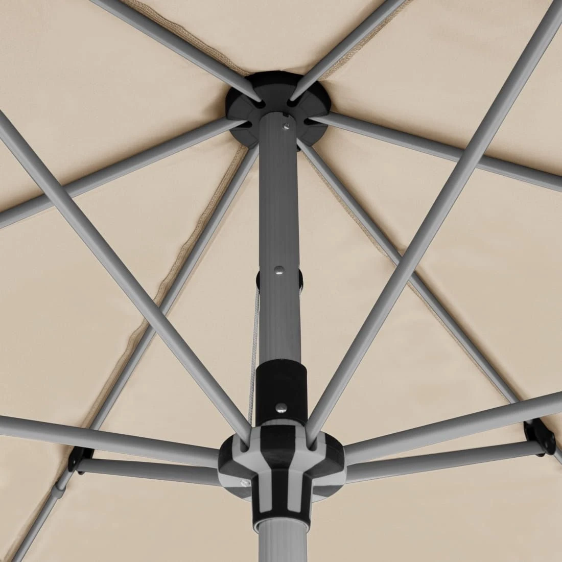 Der Sonnenschirm Silver bietet eine Höhenverstellung mittels zusätzlichen Unterstock. Die Stoffe sind von hoher Lichtechtheit, fleckschutzimprägniert, wasserabweisend und für Handwäsche geeignet. Eine hochwertige und leichtgängie Kurbel sorgt für einfachste Bedienung. Der Schirmbezug ist mit selbstspannenden Elementen an den Dachstreben befestigt. Die Streben sind doppelt verstärkt.