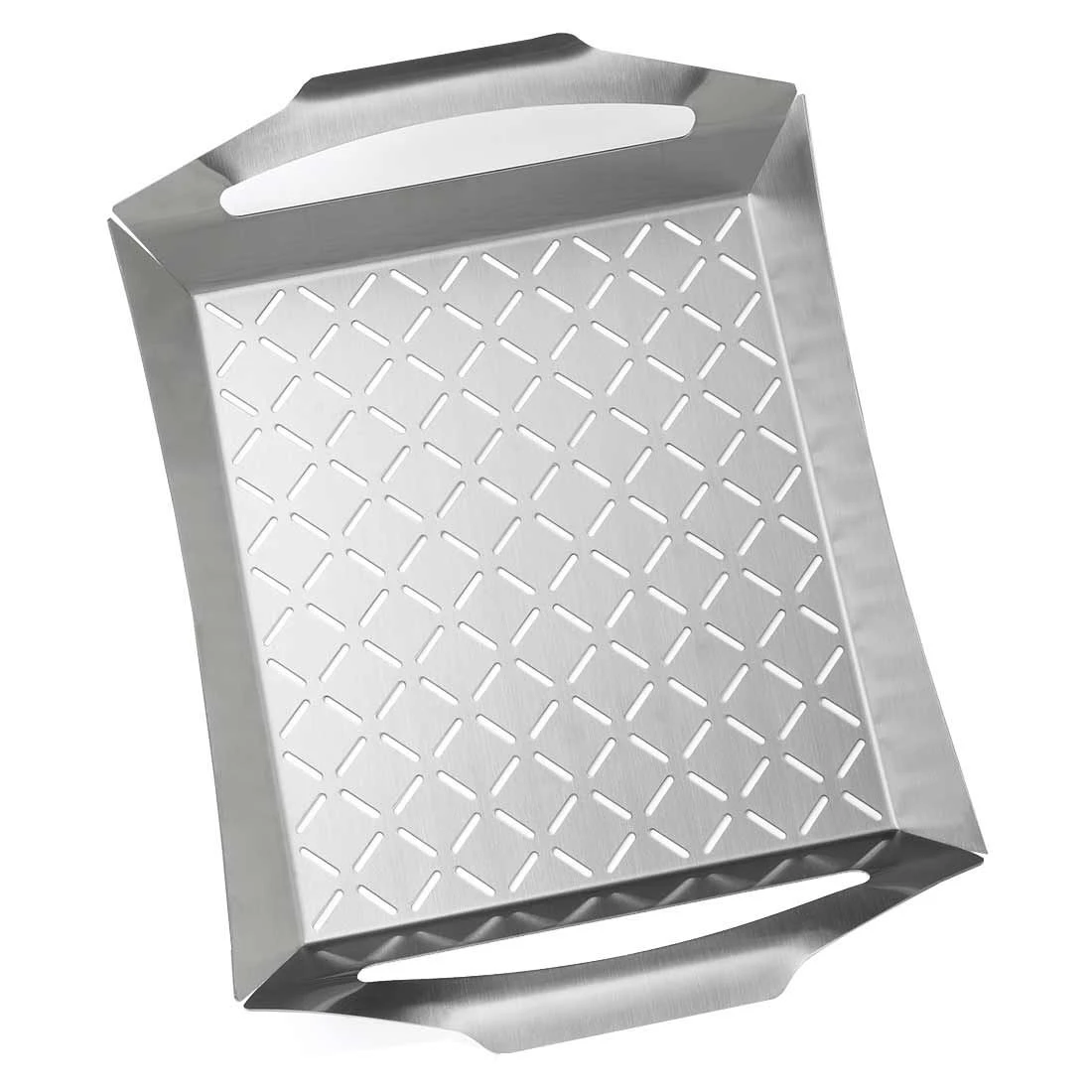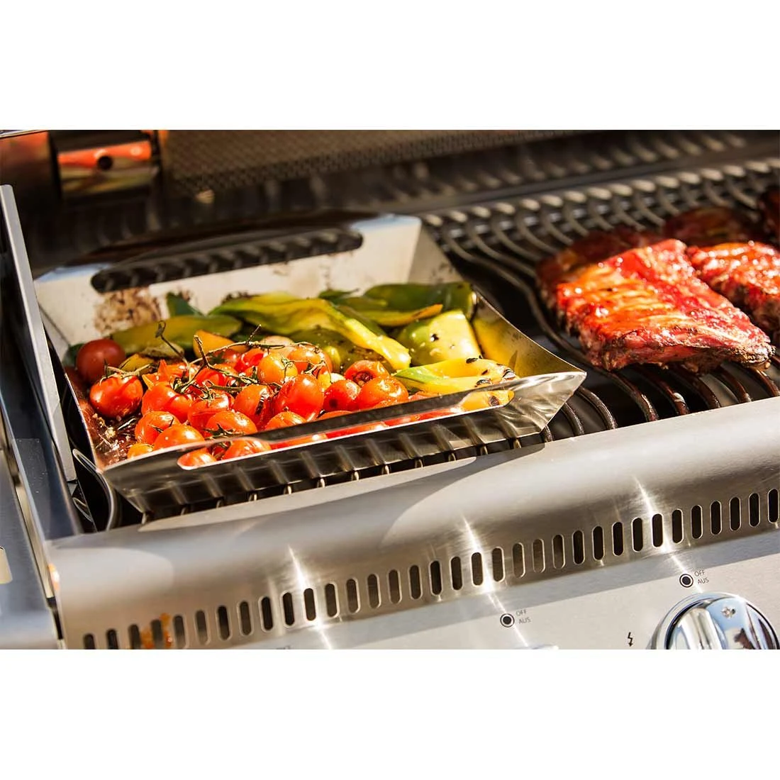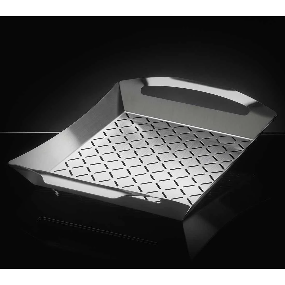 42 cm x 30 cm großer Napoleon® PRO Gemüsekorb aus Edelstahl mit perforierter Unterseite zum optimalen Grillen von knackigem Gemüse. Mit seitlichen Griffen.