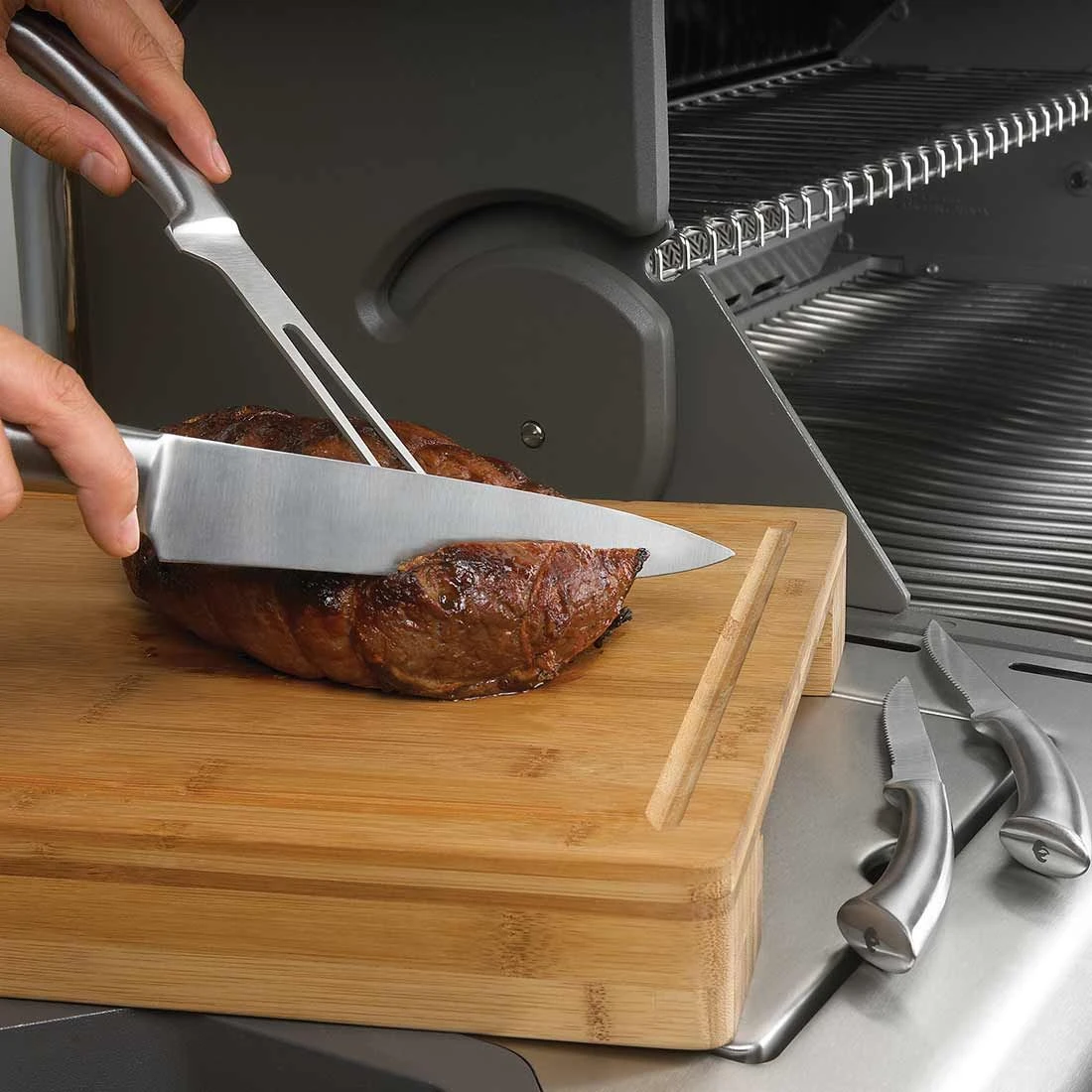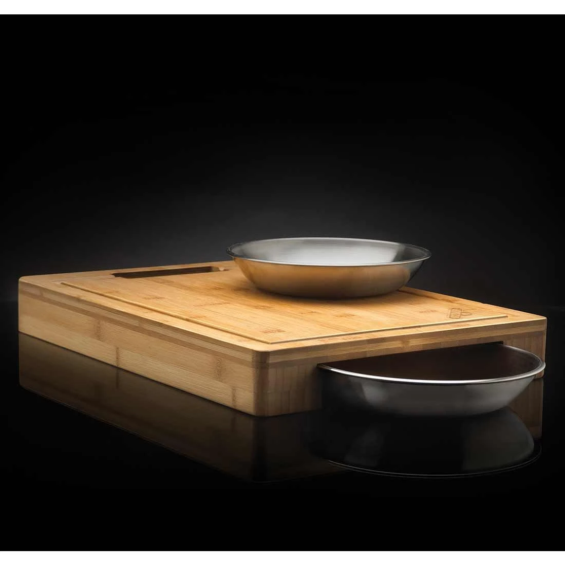 Hochwertiges Napoleon® Bambus-Schneidebrett mit 2 Edelstahlschalen zum Auffangen von Fleischsäften und Sichern von geschnittenem Gemüse (33 cm x 46 cm x 5,5 cm).