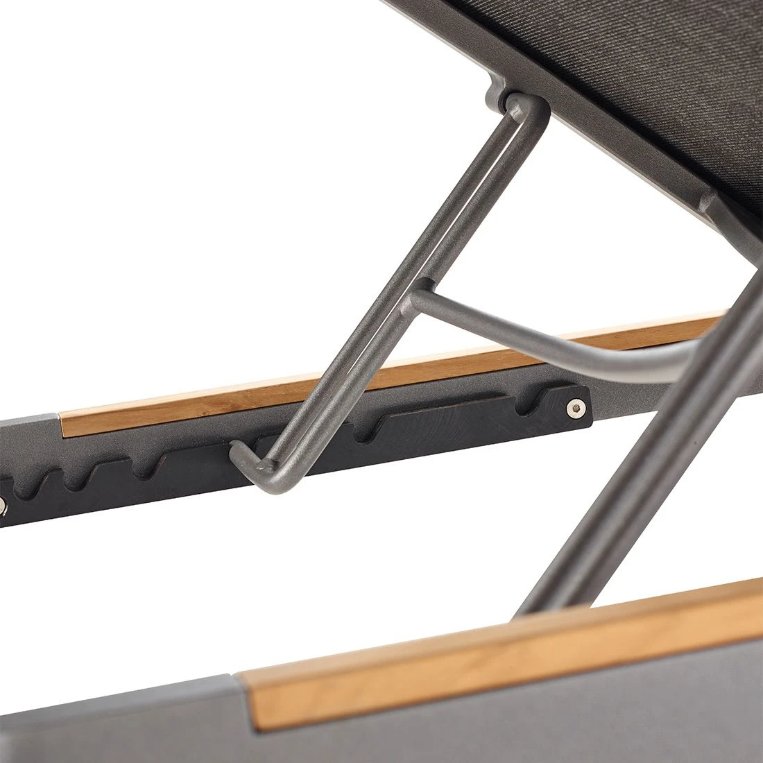 Das Gestell besteht aus pflegeleichtem und wetterfestem Aluminium in der Farbe Anthrazit. Für die Bespannung der Sitzfläche wird hochwertiges Textilene in der Farbe Coal verwendet. Es zeichnet sich durch eine hohe Robustheit gegenüber Hitze und Frost aus und ist leicht zu reinigen.